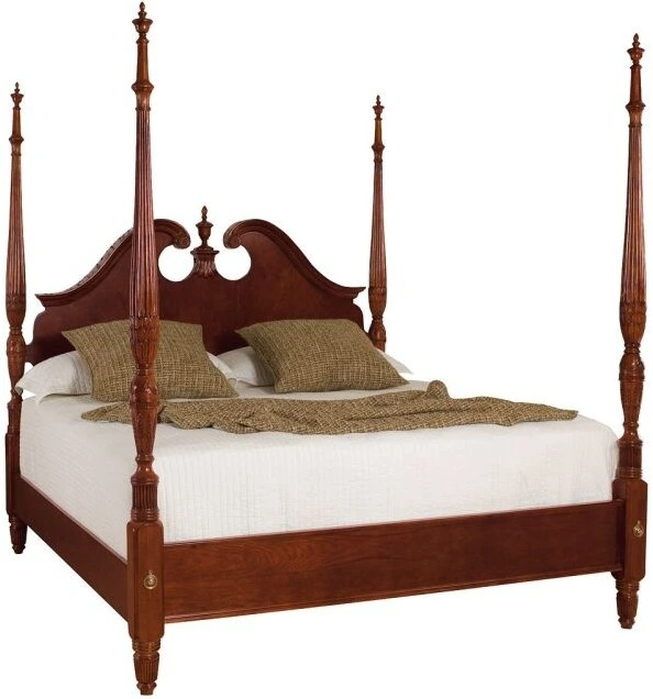 Traditional pediment poster bed with intrically carved tall posts and shaped headboard crown with pediment keeps up with the 18th century styling of the past. Available in queen, king and california king sizes.Read More