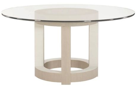 With a clean, modern form and combination of finishes, the Axiom round dining table offers glamorous transitional style and unique visual appeal. In this sleek, geometric design, a round glass top with an eased edge rests on an open circular base with four leg posts.Read More