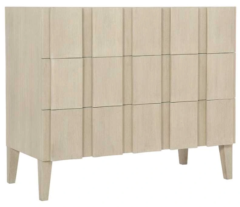 The three-drawer East Hampton hall chest features shaped vertical overlays, adding depth and dimension to the minimalist design. Quartered ash veneers are presented in a Cerused Linen finish, created using light wire brushing and cerusing techniques to highlight the linear wood grain.Read More