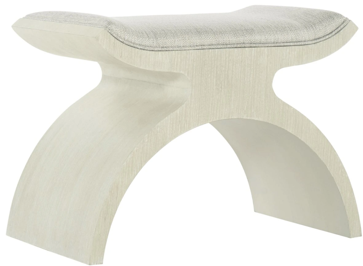 The East Hampton collection is defined by its minimalist aesthetic, achieved through soft finishes, graceful curves and subtle accents. Sculptural in shape, this unique bench features a frame with an open arch and a curved seat. Blending seamlessly with the light Cerused Linen finish, the muted gray fabric contributes to the sophisticated palette of neutrals.Read More