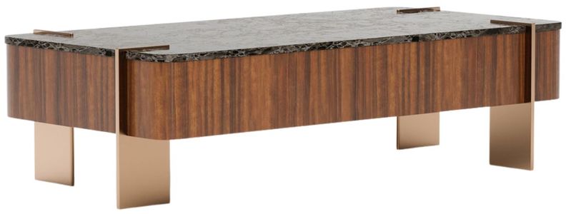Extending the statement, the Altura rectangle stone top cocktail table features Smoked Walnut, softened edges, and a honed stone top for tactile contrast. Champagne Gold blade legs slice through with precision, creating a balanced focal point for contemporary interiors.Read More