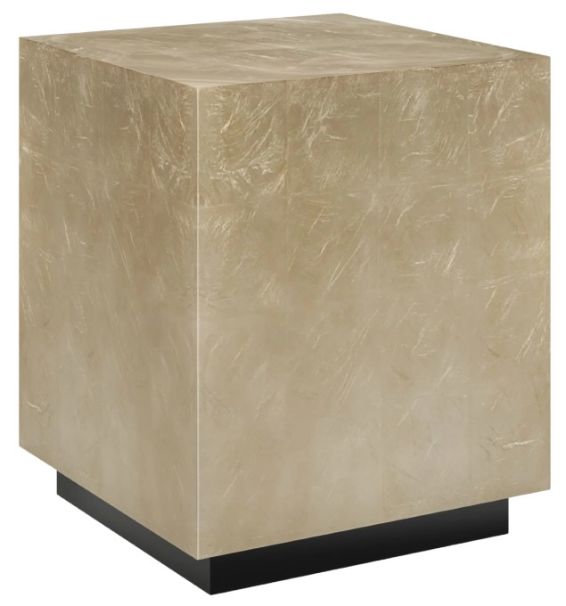 Not all end tables in a room need to match. This piece is the perfect accompaniment to our drum-shaped Cocktail Couture tables. Like its companion piece, this square option shimmers in Taupe Silver Leaf with slim a plinth base in Almost Black.Read More