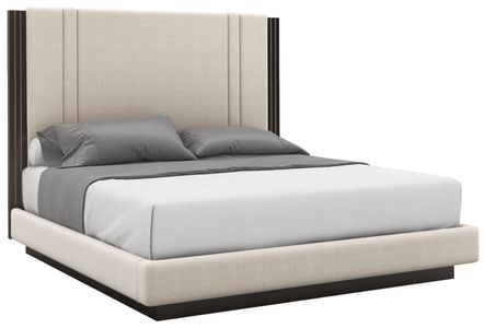 Dashing and distinctly modern, this architecturally inspired bed introduces an updated take on a classic parsons style. Its dramatic headboard is upholstered in a light-toned performance fabric, richly contrasted by dark chocolate trim. An inlaid metal accent in champagne gold adds warmth and a sophisticated detail.Read More