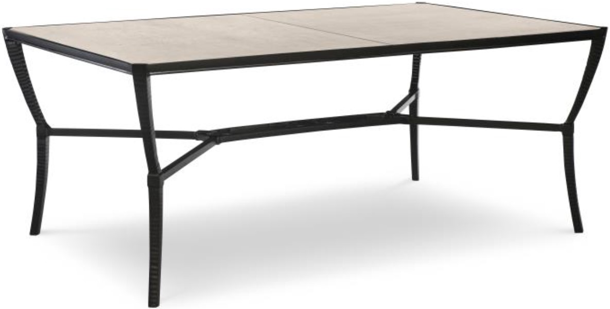 Classic Spanish-Mediterranean styling. Saber detailing and decorative fob accents featured on all pieces. This 72-inch rectangular dining table was designed for indoor or outdoor placement. It has a hand-made, sand-cast aluminum frame that has the look of hand wrought iron and is finished with a durable, weather resistant, custom powder coat finish.Read More