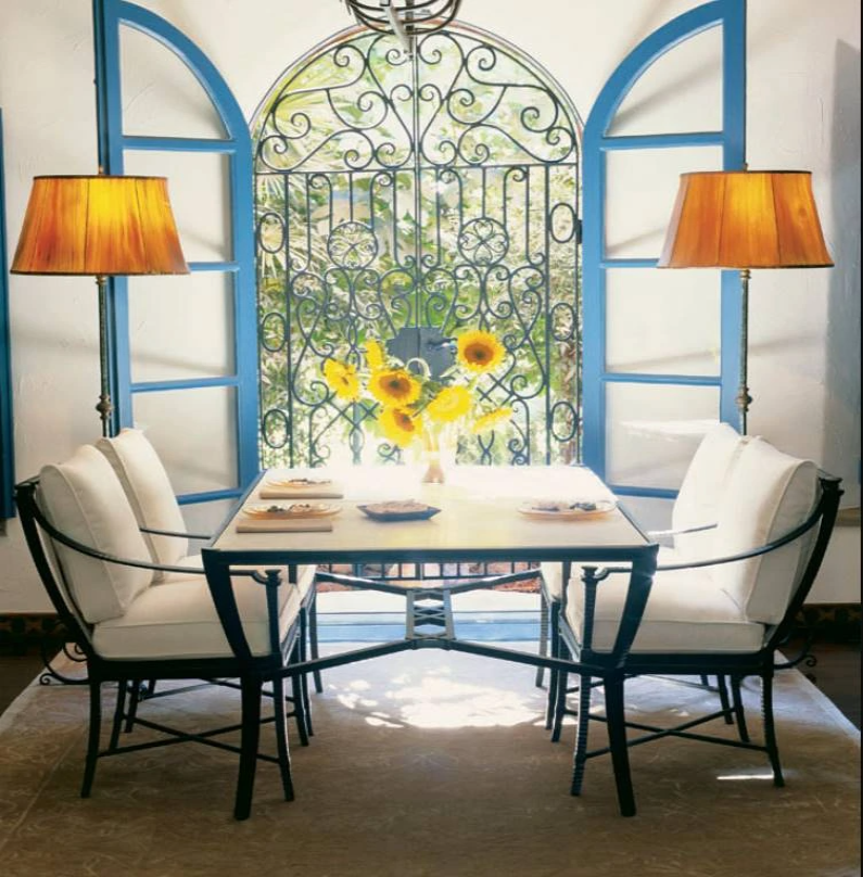 Classic Spanish-Mediterranean styling. Saber detailing and decorative fob accents featured on all pieces. This 72-inch rectangular dining table was designed for indoor or outdoor placement. It has a hand-made, sand-cast aluminum frame that has the look of hand wrought iron and is finished in Cordoba, a durable, weather resistant, multi-step antique powder coat.Read More