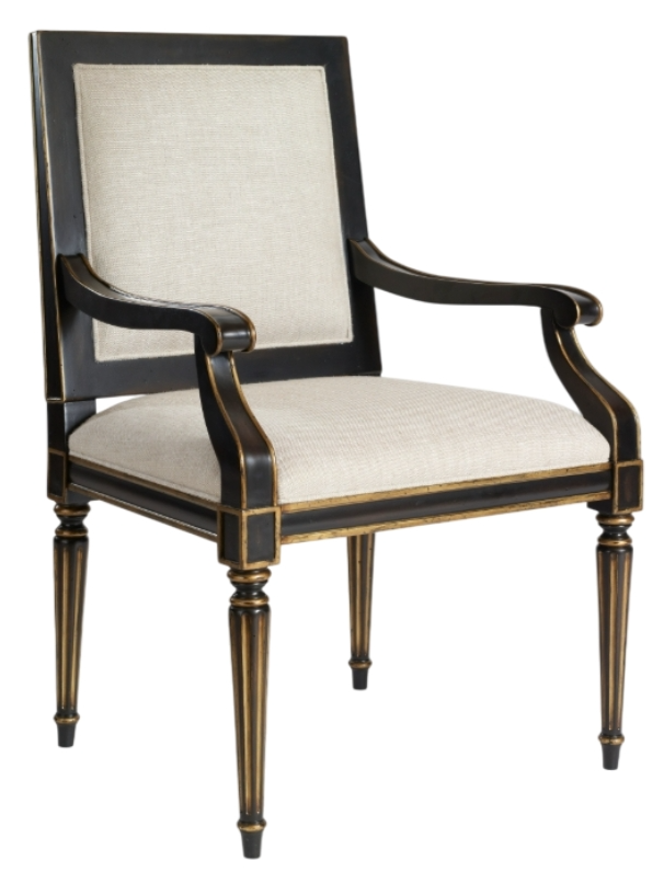 This Regency inspired square back chair features fluted turned legs, framed aprons and back all finished in a distressed antique black and gold finish and natural texture linen fabric. Make a bold statement by incorporating this stunning chair into your home.Read More
