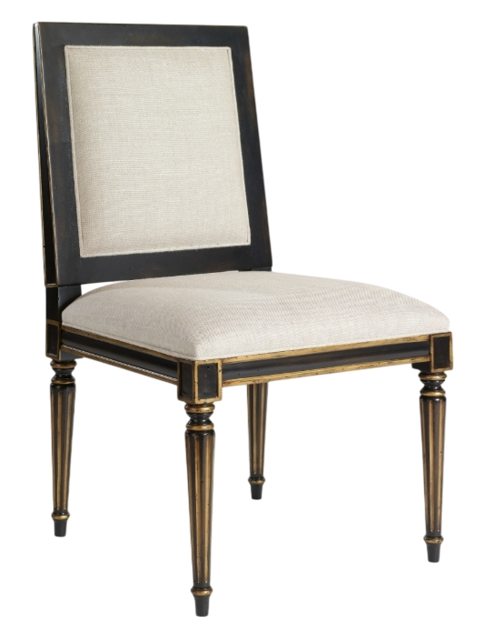 This Regency inspired square back chair features fluted turned legs, framed aprons and back all finished in a distressed antique black and gold finish and natural texture linen fabric. Make a bold statement by incorporating this stunning furniture into your home.Read More