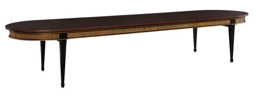 This Regency inspired oval dining table features distressed mahogany, boxwood and cerajeira crotch veneers, fluted aprons & bold tapered legs all finished in a distressed black and gold with the top in a distressed, warm mahogany finish. The two 24" leaves store conveniently inside the top cavity protected and out of the way.Read More