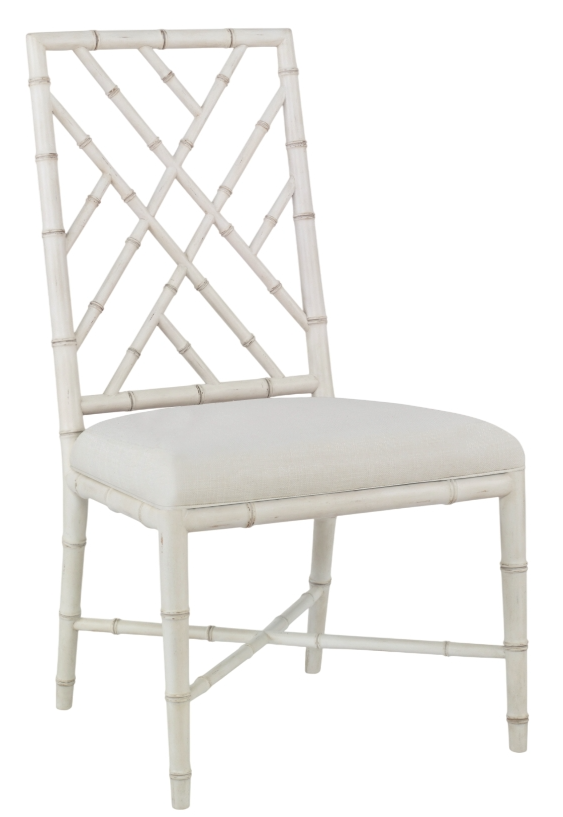 With its lattice back, bamboo styling, and beautiful rubbed through finish, this dining chair is nod to classic Chinese Chippendale style. Truly timeless, this chair works in all settings and styles. An upholstered seat in linen like flax colored fabric.Read More