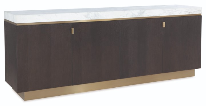 The Cadence Credenza features a thick, Carrara marble top set off from the case by a band of antique brass trim. Oak solids and narrow heart oak veneer finished in a rich, brown, Mocha finish envelop the four door base, all resting on an antique brass plinth base.Read More
