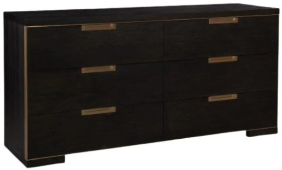 Crafted from Oak solids and narrow heart oak veneer the Cadence Six Drawer Dresser is reminiscent of campaign style furnishings with the antique brass trim framing the six, soft close drawers, and the antique brass drawer pulls recessed into each drawer. The finish is a rich, deep brown, mocha that amplifies the metalwork.Read More