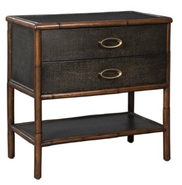 This nightstand features rattan and gmelina framing with veneered canvas on the faces and tops. Canvas is finished in a rubbed dove grey and lacquered with a moderate sheen with the rattan framing finished in a rich chestnut creating a beautiful contrast effect. Two drawers with soft close mechanisms sit above one open shelf giving ample space for storage bedsideRead More