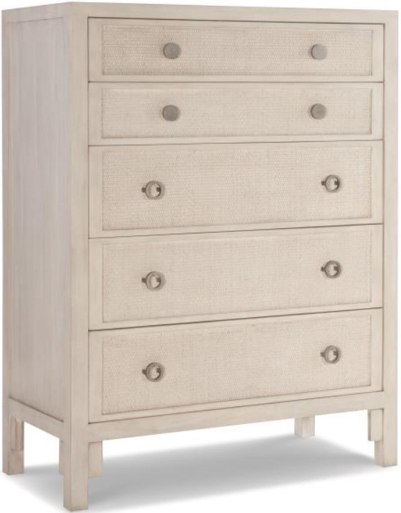 Our Mackinaw dresser is crafted from Mahogany solids and veneers with natural woven cane on the drawer faces. Designed with circular antiqued pewter hardware that serves as a counterpoint to the linear presence of the dresser. Three larger drawers on the bottom with two smaller drawers on top all feature soft close mechanisms.Read More