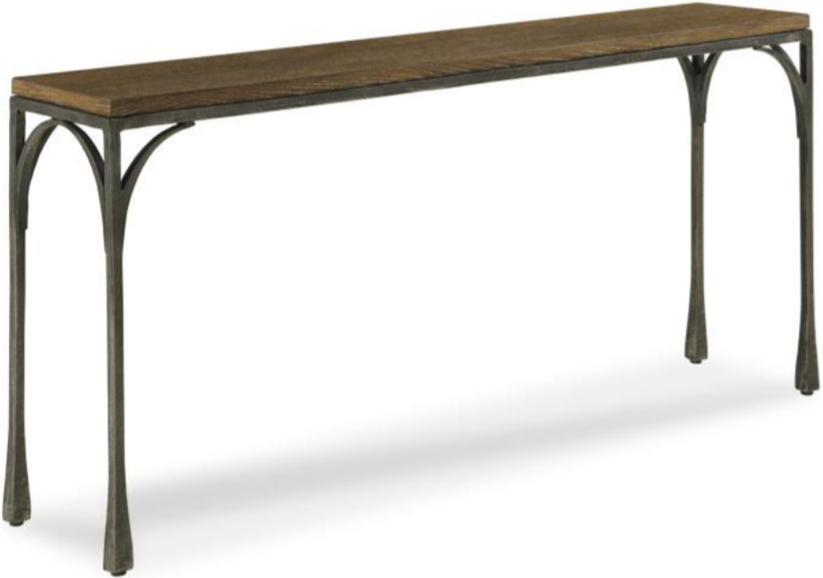 This textured iron base features flared feet and curved arched aprons that support an oak veneer top. The top is available in any finish of your choice. The narrow width makes this console a perfect piece for any hallway or to tuck behind a sofa or sectional.Read More