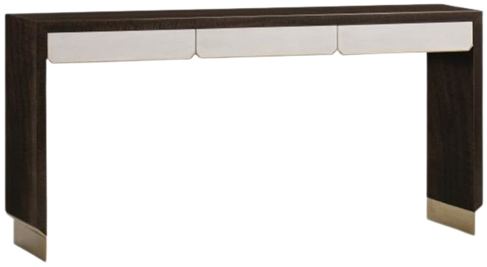 Elevate your living room with this Fractal Console Table from Century. Figured Eucalyptus veneer with white lacquer finished embossed leather drawer fronts and brass finish metal feet. Make a bold statement by incorporating this stunning furniture into your home.Read More