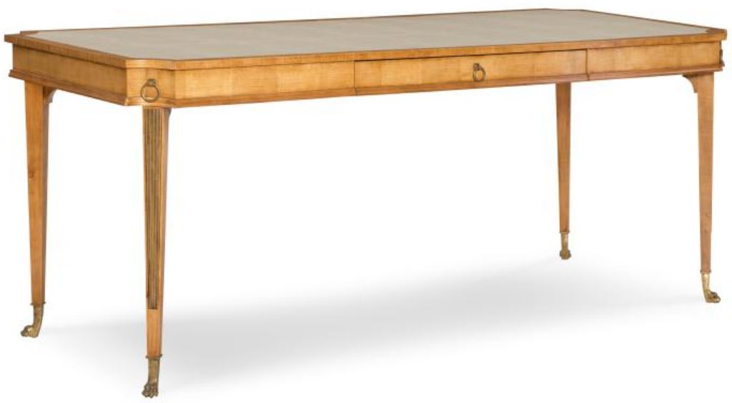 Antique butterscotch finish on Maple solids and figured Sycamore veneer with Bronze finish metal accents and light grey Brisa leather top