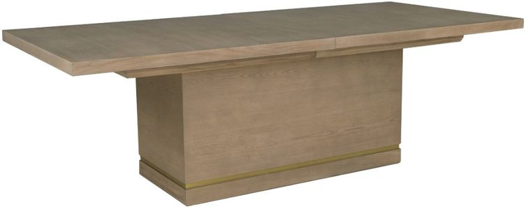 Crafted of red oak solids and veneers, our Everett dining table features a thick plank top resting above a solid rectangular base, accented by an inset metal band for added warmth. For added seating capacity, the tabletop expands from 96" to 120" wide with one 24? Leaf (included).Read More