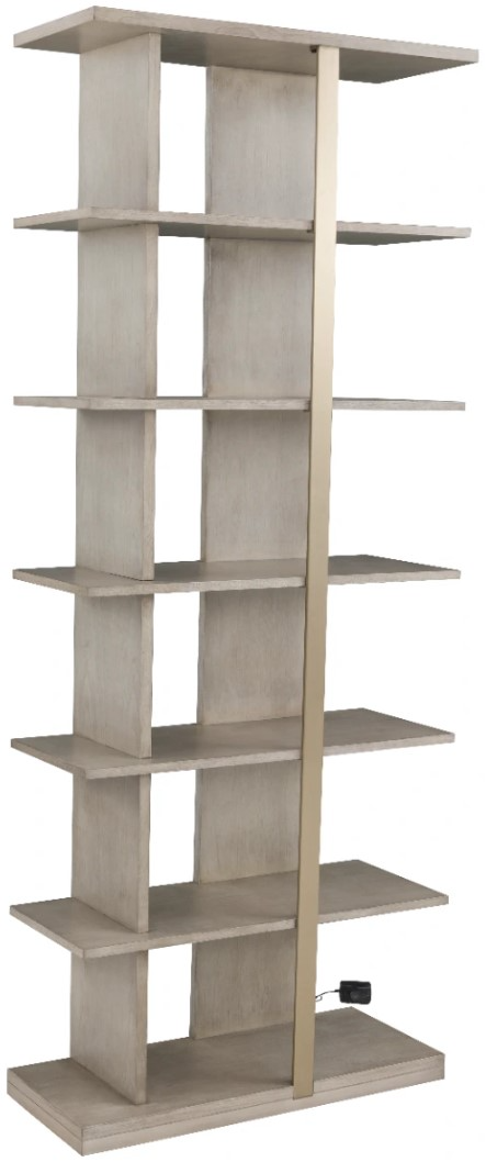 The brushed champagne metal finish paired with the Sheer Dove wood finish can look contemporary or classic depending on the style of the room it is in and when these etageres are paired with the Carlson credenza they can function as a media wall system or work well as functional storage in a dining room