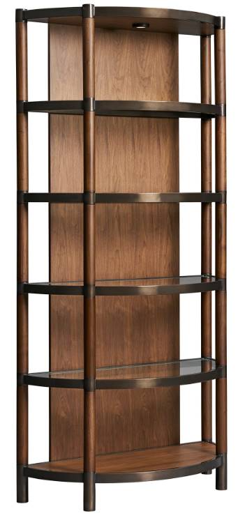 The warm Walnut wood of this Duvall etagere pairs with the dark bronze accents to create an open but substantial bookcase. Of the five shelves, four are glass and the bottom shelf is Walnut, with an integrated lighting feature at the very top shining light all the way to the bottom.Read More