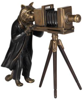 Solid brass sculpture of a well-dressed feline using a vintage camera.