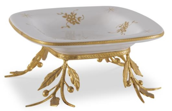 The Woodland Tray is a porcelain masterpiece adorned with hand-painted 24 karat gold motifs. Lost-wax cast metal details, also painted in gold, enhance its elegance, making it a luxurious addition to any home decor ensemble.Read More