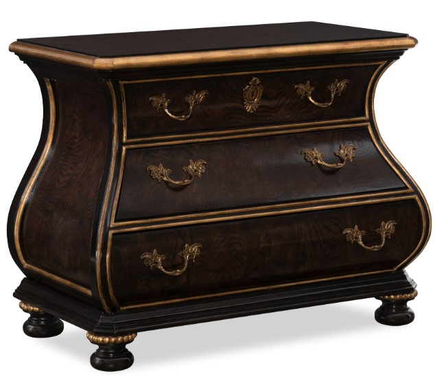 Trimmed with venetian gold, detailed polished brass hardware opens three sliding drawers.