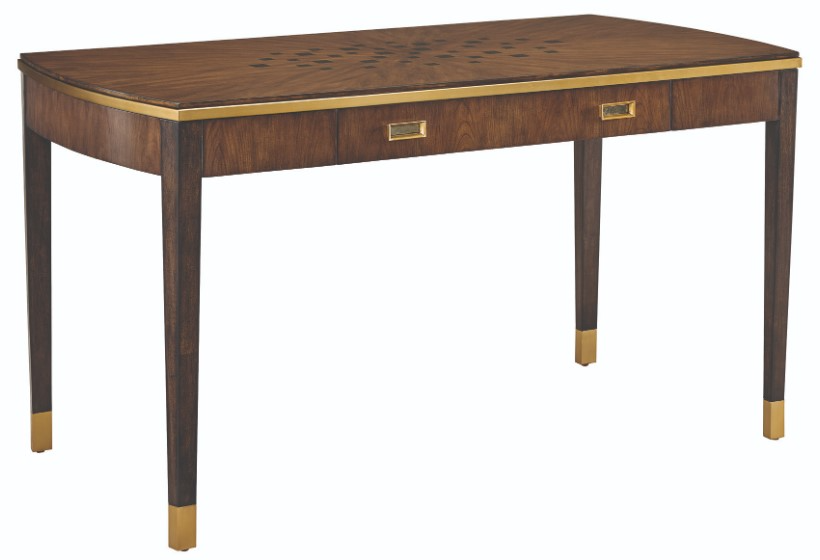 Satin brass hardware with antique mirror detail opens the desk’s 1 sliding drawer.