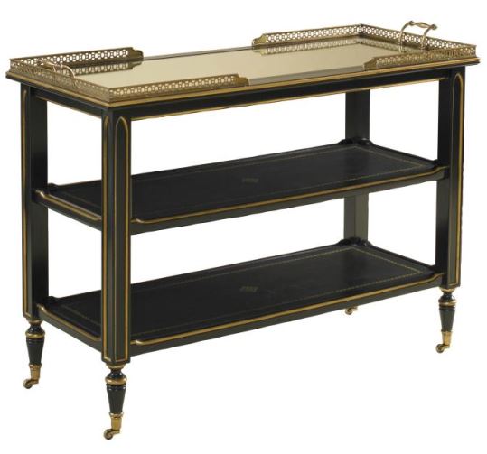 This Trolley Serving Cart features an ambassador leather inlay with gold tooling accents, mirror glass top, brass gallery and casters.Read More