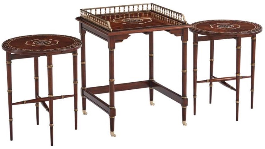 A nest of three fine mahogany and Morado veneered tables with fine mother of pearl inlay, the main square table with a three-quarter turned brass gallery on ring-turned tapering legs with gilt details.Read More