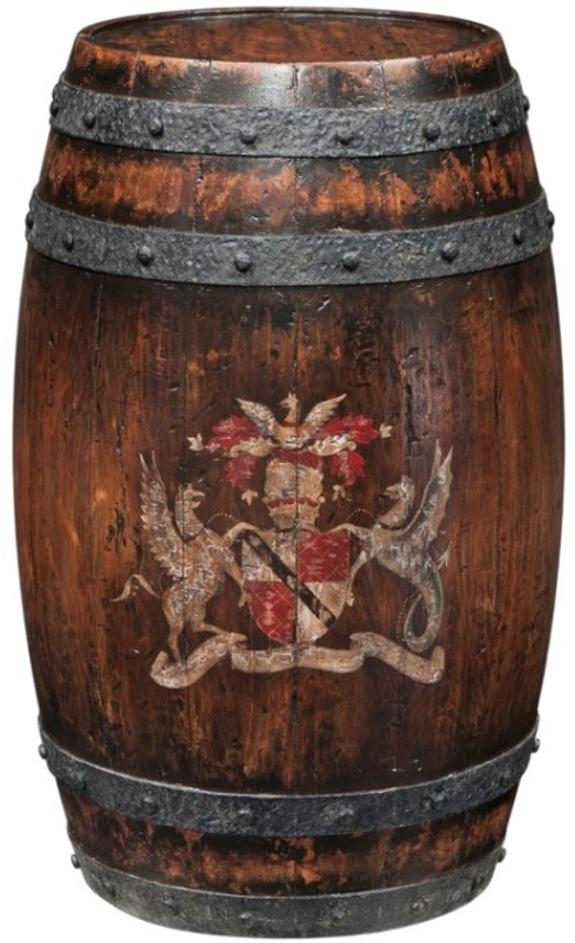 An antiqued wooden barrel, the circular top above planked sides bound by hand-forged iron riveted straps and hand-painted with the Spencer coat of arms. Available in a variety of finishes.Read More