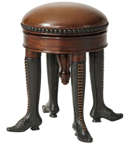 A verdigris brass adjustable piano stool, with a circular upholstered seat, on Can-Can leather laced boot legs. The original French 19th century. Include this Curious Ottoman in your home to bring out the beauty and style of your dining or living room.Read More