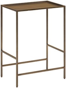 The metal side table features a sleek design with a distinctive tray top and a minimal geometric frame in smoked gold finish. This compact accent piece provides flexible surface space while showcasing a sophisticated metallic finish that complements the transitional aesthetic beautifully.Read More