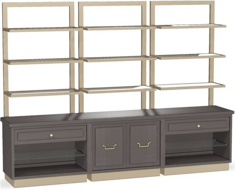 The Sinclair Etagere features two doors, two drawers, and two glass shelves on the case, with an internal shelf. On top, it offers nine adjustable shelves, providing ample storage and display options in a stylish and versatile design.Read More
