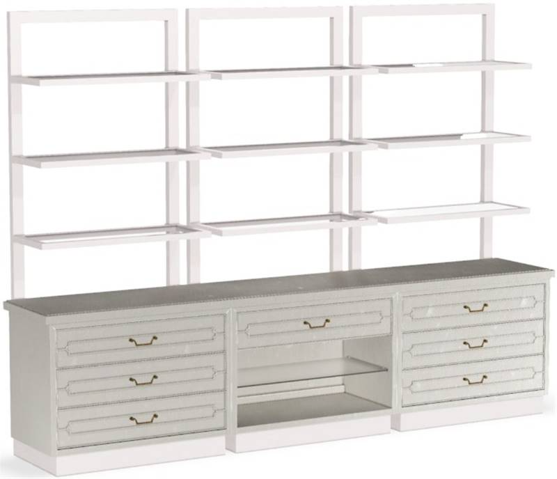 The Sinclair Etagere features a sleek design with seven drawers and a glass shelf on the case, complemented by nine adjustable shelves on top. This multifunctional piece combines storage and display capabilities, ideal for organizing and showcasing various items in any space.Read More