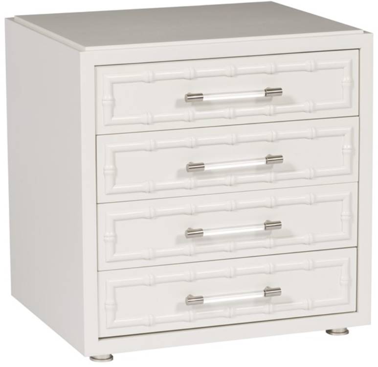 Finish: White Frost. Bamboo Face Molding (F05). Satin Brass Horizontal Acrylic Bars (H19). Centered with Casters (P1)