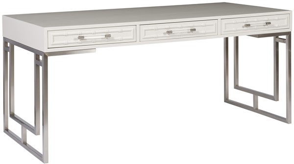 Shown in a white frost, the Berkley Desk is made with beech solids and veneers/maple solids. It features 3 spacious drawers and a metal geometric base in a brushed nickel finish.Read More