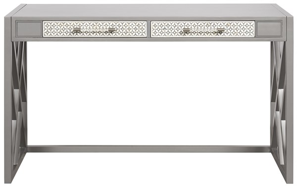 Shown in a dupree finish, the Bryson Desk is made with beech solids and veneers/maple solids. It features two drawers and a wood fretwork base, bone circle face molding, and brushed nickel horizontal acrylic bars.Read More